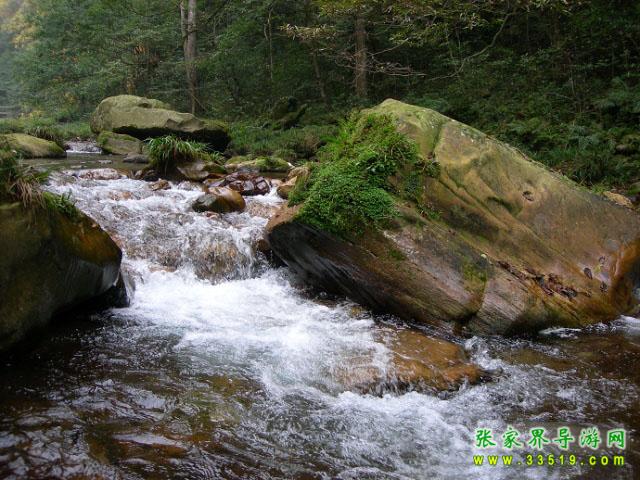 幽峽幻境下行400多米處,一泓溪水跌落于水面約20平方米、深2米的潭中。潭水清澈,溪石紅潤。潭邊橫臥一高、寬各2米的方體巨石。石邊兩株楠木,一株直立,冠如大傘。坐立大石上俯視,可見潭內(nèi)野魚成群悠游。逢桃花春汛或夏日漲水,游魚跳起離水七八十厘米高,或飄或飛,如落英繽紛。