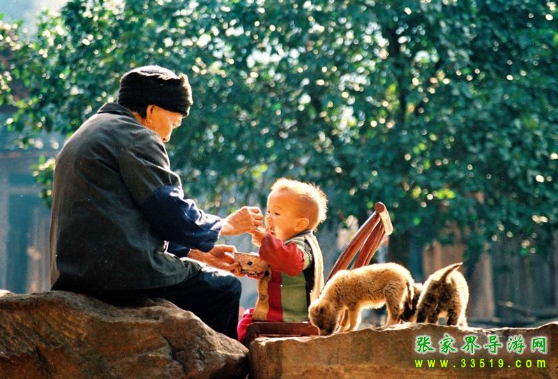 孩子們自從娘胎里出來,父母?jìng)兙徒o備好了一首首童謠。在襁褓中時(shí),有簡(jiǎn)短的搖籃曲。“我的小寶貝,睡吧快快睡,你莫哭,快長(zhǎng)大,我的小寶貝”,伴以“喲嗯”之類的喉音和鼻音??摁[的孩子在這低低的吟哦中,在這輕柔的春風(fēng)中,會(huì)緩緩的走入夢(mèng)鄉(xiāng)。到孩子牙牙學(xué)語時(shí),就會(huì)換上新的內(nèi)容。為讓孩子從小懂得廉恥,大人會(huì)教孩子《蟲蟲兒飛》:“打板板,逗蟲蟲兒,蟲蟲兒飛,飛到嘎兒(外公)去。嘎兒不趕狗,咬到蟲蟲兒的手;嘎兒不殺雞,蟲蟲兒不回去;嘎兒不打蛋,蟲蟲兒不吃飯;嘎兒不殺鵝,蟲蟲兒不過河。”(土家把孩子名字叫得賤,喊成“蟲蟲兒”)。在唱的同時(shí)手把手地教孩子做蟲蟲飛的動(dòng)作。唱完后,又會(huì)用手指點(diǎn)點(diǎn)孩子的左右臉,刮一下孩子的鼻子,“這兒也丑,那兒也丑,鼻子刮豬油。”意思是好吃是丟臉的,蟲蟲兒可不能這樣。勤勞是做人的根本,也是土家人的傳統(tǒng)美德,“三歲看大,八歲看老”,大人會(huì)教些勤勞的童謠?!顿u豆腐》道:“一顆豆子圓又圓,推成豆腐賣成錢,別人講我生意小,小小生意賺大錢。”為讓孩子自小懂得親疏,教孩子《推磨》:“推磨拐磨,推的粑粑白不過。推粑粑,接嘎嘎,嘎嘎不吃娃娃的酸粑粑;推豆腐,接舅舅,舅舅不吃娃娃的酸豆腐;推合渣,接姨媽,姨媽不吃娃娃的酸合渣……”夏日的夜晚,一家人出來在月亮地里歇涼,有夜火蟲(螢火蟲)舉著火把飛來,母親會(huì)以夜火蟲打頭,以“一問一答”的聯(lián)句方式,考考孩子的記憶力:“夜火蟲,夜夜來,嘎婆接你吃茶來。什么茶?豆茶。什么豆?黃豆。什么黃?朱砂黃……”