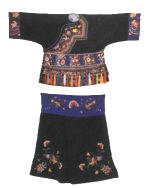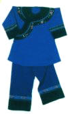 據(jù)史載,有關(guān)土家族的服飾宋代稱“溪布”、“峒布”、“土錦”等。后受漢族先進(jìn)技術(shù)影響,土家人用自織自染的“土布”做成圍裙。到現(xiàn)代,土家服飾發(fā)生了巨大變化,但仍保留了許多傳統(tǒng)樣式。土家族人始終著以琵琶襟為特征的滿襟衣。托肩矮領(lǐng)大袖口,滾花邊。男捆腰帶,女套繡花圍裙。頭上均包青布帕或絲帕,男帕左方垂一節(jié)過耳,婦女全包頭。未婚閨女留長發(fā)扎辮,用紅頭繩扎上下兩端,額前前留“劉海”。已婚婦女挽上發(fā)管,別簪,插銀首飾。褲子多為青、藍(lán)色、上結(jié)白布褲腰,褲腳短且大。青壯年男子打綁腿,女褲以對(duì)襯色布加邊,上綴三條均等的梅花條,腳上穿青布瓦鞋,包白色裹腳布。若遇喜慶節(jié)日或走親訪友,則另有一番梳妝打扮,如加佩牙簽、銀牌等。