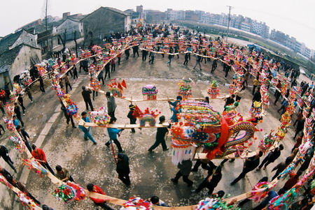 龍舞是中國民間體育藝術(shù)。大庸境內(nèi)的板凳龍是 別具一格的龍舞形式。尤其桑植縣白族人民,對舞板 凳龍有著特殊偏愛。 白族同胞耍板凳龍,相傳起于漢代,由白族先民 “舞龍求雨”的宗教活動演變而來。 板凳龍有兩種樣式。一種是簡式板凳龍,由二個 舉長凳為頭,一人在后選適當“舞臺”表演;另一種 是“篾扎板凳龍”,即用竹篾扎成龍形置于板凳之上 ,以木腳示龍爪,造型美觀,逼真。耍板凳龍又分兩 種舞式,一為獨凳龍,一為九節(jié)龍(九張板凳相接)。 舞板凳龍動作有“二龍搶珠”、“黃龍穿花”、“二 龍戲水”、“金蟬脫殼”、“黃龍盤身”等。永順、 慈利還流行草把龍,其龍耳稻草扎成。龍舞還有“干 龍”、“濕龍”之分,“干龍”多為娛樂,“濕龍” 則為求雨。“龍”到之處,百姓必潑水助威,舞者一 身透濕,盛為熱烈歡快。