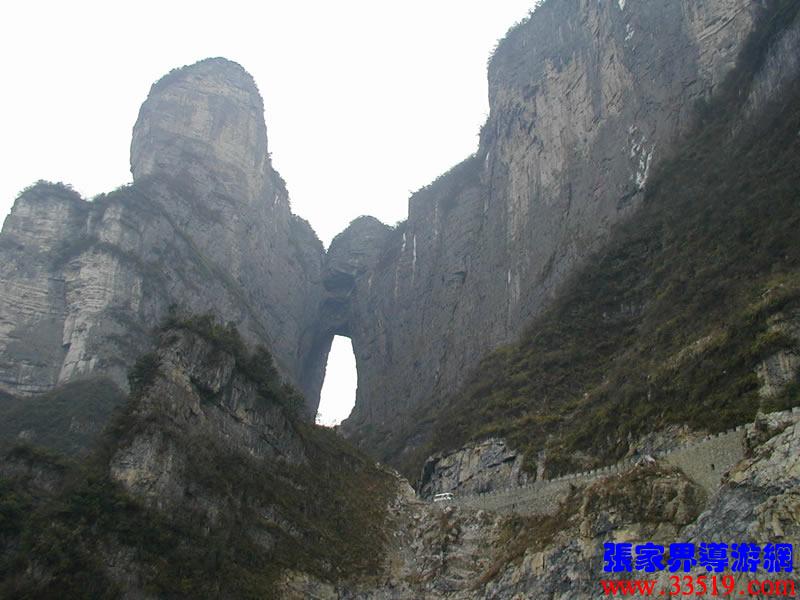 (俯視天門)站在這里可以俯視面向北面的天門洞,以及天門山公司正在修建的通天大道。1999年11月世飛賽期間,中央電視臺6號機(jī)組正是在這里拍攝飛機(jī)穿越天門驚人場面的。這兒距天門洞垂直高度200多米。