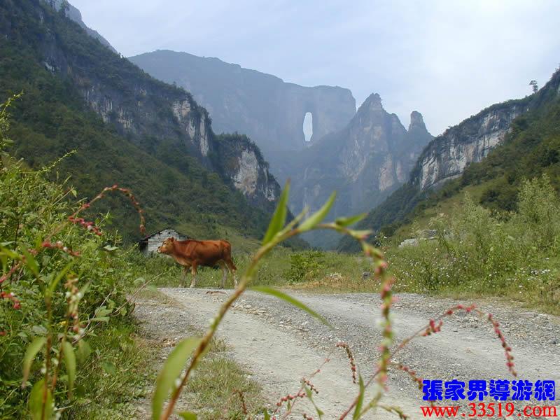 (天門洞)在天門山1264米高的絕壁之上,生出一個南北洞穿的天然門洞,洞底至洞頂131.5米,寬37米,縱深30米。洞北面頂部邊緣,有倒垂的龍頭竹,它的根像龍頭,樹葉像鳳尾,因此又叫鳳尾竹。東側(cè)是高約200多米的溝槽,有泉水從上面飄散,落下點點梅花雨。據(jù)說誰能張口接下48滴梅花雨,便可羽化成仙。天門洞口,經(jīng)常能看到巖燕飛舞,山鷹盤旋。隨著天氣的變化,天門洞有時候吞云吐霧,有時候明朗似鏡,構(gòu)成循環(huán)往復(fù)、瞬息萬變的氣象景觀。