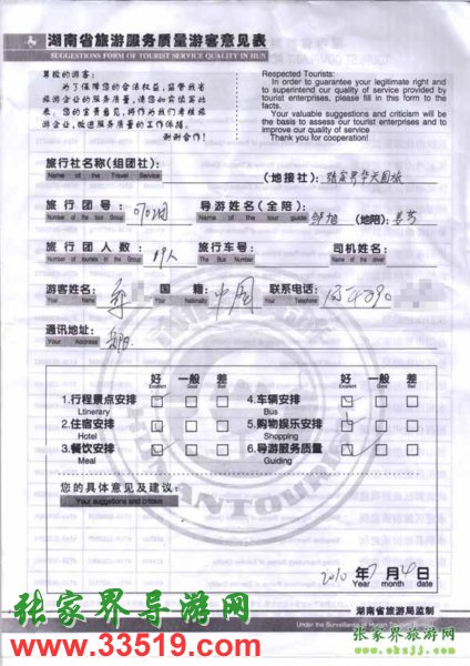 2010年7月4日岳陽鄒先生一行19位旅游質(zhì)量反饋