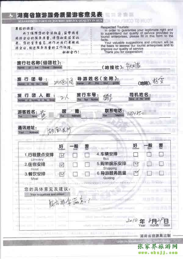 2010年8月29日長(zhǎng)沙黃先生一行2位旅游質(zhì)量反饋:服務(wù)非常滿意